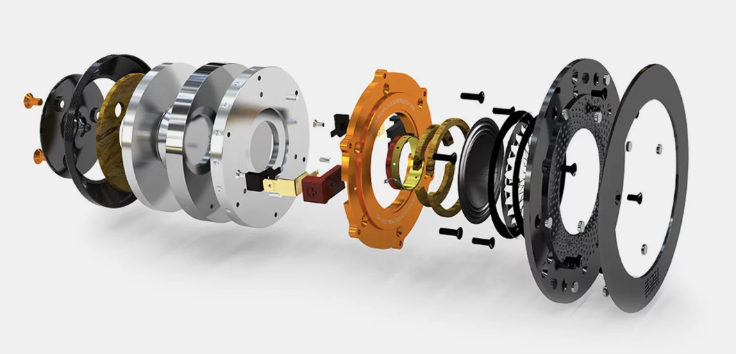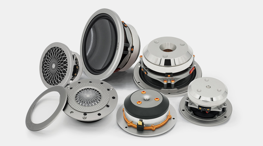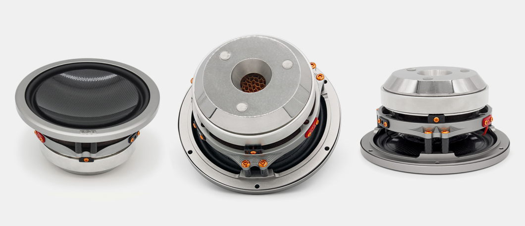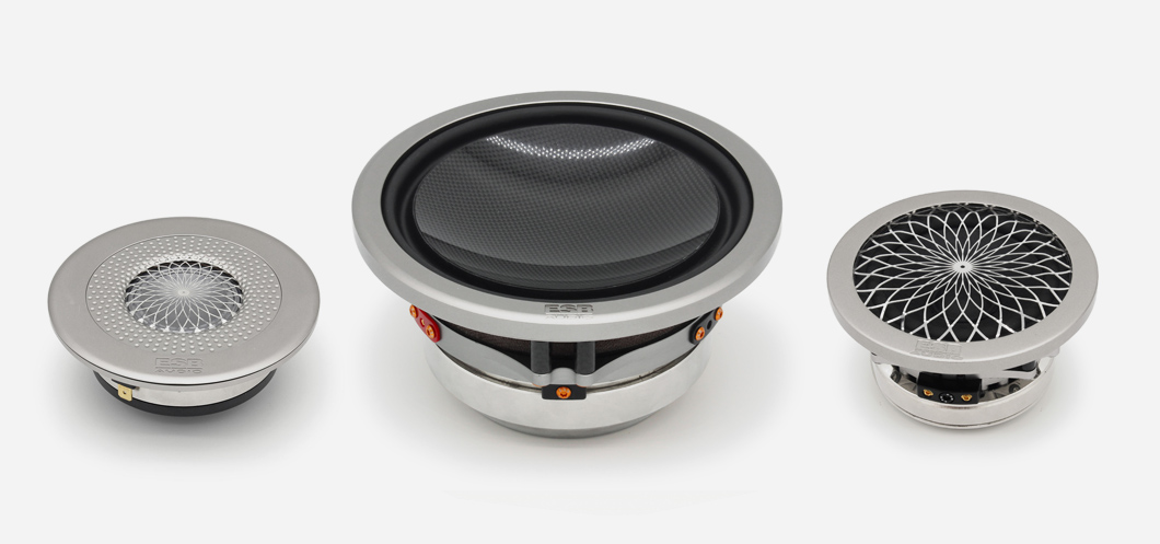 A basszus hangszóró membránja a világon elsőként használ tiszta szén nanocsövekből készült dupla szénszálas burkot. A 45°-os szögben keresztezett kettős burok kiválasztása lehetővé teszi a feszültségeloszlást a nanocsövek tengelye mentén, ami egy rendkívül könnyű membránt eredményez, amely olyan merevséggel és alakíthatatlansággal rendelkezik, amilyet még soha egyetlen hangszóróban sem értek el. A félgömb alakú membrán teljesen egy darabból készült, még a hagyományos porvédő használata nélkül is. Ez a módszer, valamint a felfüggesztés hátsó felülethez való ragasztása és a membránnak a felfüggesztéssel való kapcsolódási ponton túlra történő meghosszabbítása révén elkerüli a bármely más basszus hangszórónál előforduló klasszikus diszkontinuitásokat, és teljesen semleges és hűséges hangvisszaadást biztosít. A membrán merevsége, amely egyébként sokkal nagyobb, mint sok fémé, a kiváló belső csillapítással együtt tökéletes "dugattyú" hatást garantál, ahol a teljesítmény nem változik a frekvenciával, és minimálisra csökkenti a belső rezgések okozta torzulást. A lejátszás sebessége a tranziensek alatt elképesztő, és nehéz vele összehasonlítani. A mozgó tekercset és a membránt egy széngyűrű köti össze, amelynek különleges alakja nagy érintkezési felületet biztosít mind a tekercs, mind a membrán oldalán. Ez garantálja a tökéletes energiaátvitelt a tekercsről a membránra veszteségek és mindenekelőtt koncentrált erőfeszítés nélkül. Általában ezt a fontos érintkezési pontot, ahol a rezgő tekercs által felszabaduló összes energia átkerül a membránra, egy egyszerű ragasztott gyűrűvel hozzák létre. Ez nem garantálja az állandó pontosságú reprodukálhatóságot, de mindenekelőtt a kis méret miatt az összes erőkifejtést egy kis területre koncentrálja, ami feszültséget okoz az alkatrészeken, és a hang deformációját és torzulását eredményezi. A hangszer testének rezonanciái a hangszer karakterének és minőségének meghatározásához elengedhetetlenül fontosak. Egy hangszóró esetében azonban ennek az ellenkezője igaz. A hangszórók kosarában lévő rezonanciák a hangszíneződések egyik jelentős okozói. Az ESB K+F részlege sok időt fordított olyan anyagok kifejlesztésére, amelyek egyensúlyban tartják az ideális kosár súlyát, merevségét és csillapítását. A végeredményt alumínium és szénszál keverékéből hozták létre. Bár az alumínium rendkívüli merevséggel rendelkezik, van egy negatív tulajdonsága, mégpedig az, hogy nem túlságosan csillapított. Ezért az ESB a repülőgépiparban használt kiváló minőségű alumíniumot (Avional) szénszállal és nagy vastagsággal kombinálta, így a kosár gyakorlatilag inert lett. Nincs észrevehető színeződés, így a hangszórók maximális tisztasággal és dinamikával működnek. Bár nagyon költséges a megvalósítás, az alumínium használata az ESB hangszórókban létfontosságú szerepet játszik a vállalat filozófiájában.