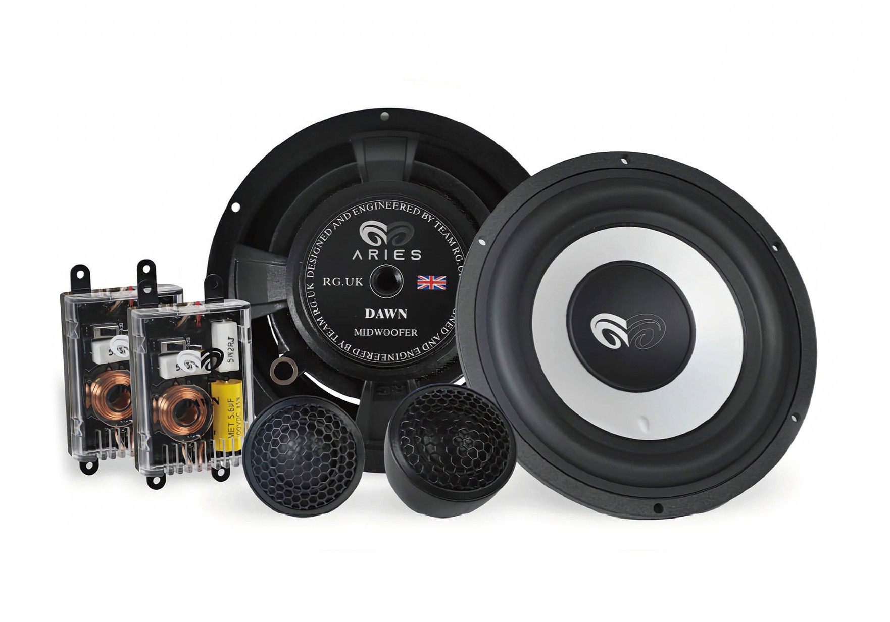 Az Aries Dawn komponens rendszer az Audible Physics és a korábbi Bowers & Wilkins mérnökök új együttműködésének eredménye. Az Egyesült Királyságban tervezett Aries Dawn hangszórók jellemzője a megfizethető hangminőségre való világos fókusz, amelyet a felhasznált anyagok és exkluzív technológiák is tükröznek. A középsugárzó membránja szabadalmaztatott Matrix Alloy Dome anyagból készült, amely magnézium és alumínium ötvözetéből áll. Ez a kombináció kiváló merevséggel, rezgéscsillapító képességgel és könnyedséggel rendelkezik, ami lehetővé teszi a pontos és jól definiált mély frekvenciák reprodukálását. A középsugárzó kiválóságát egyedülálló, középről eltolódott membrán is kiemeli. Ez a szabadalmaztatott technológia javítja a rendszer frekvencia-válaszát, megerősíti a membránt a súly növelése nélkül, és növeli annak felületét is, ami a basszus komponens előadásában is megmutatkozik. A tartós felfüggesztés minimalizálja azokat a mozgásokat, amelyek érintkezést okozhatnának a 25 mm-es lengőtekerccsel és a 80 x 18 mm-es robusztus ferit mágnessel. A különlegesen tervezett öntött kosár rendkívül merev, kiküszöböli a rezgéseket, és kevésbé deformálódik a membrán mozgása során, mint a hagyományos acél kosarak. Emellett nem csökkenti a mágneses teret, és hatékonyabban vezeti el a hőt a lengőtekercsből. A középsugárzóra zökkenőmentesen csatlakozik a 25 mm-es magassugárzó, melynek kupolája selyemből készült. Ennek az anyagnak és az optimális hangolásnak köszönhetően nagyon finom és részletes hangokat értek el bármiféle hangszín torzítás nélkül. A csomag tartalmazza a közép- és magassugárzó minőségi frekvencia-keresztváltóit is, amelyek kényelmes telepítést biztosítanak.