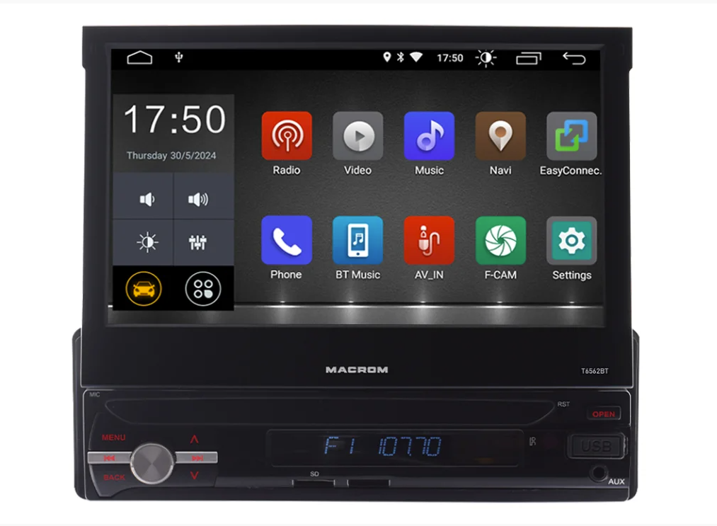 A MACROM M-T6562BT egy univerzális multimédiás egység Android 10 operációs rendszerrel és 7″ kapacitív érintőképernyővel, amely motorosan kihúzható a 1DIN méretű készülékházból. Ennek köszönhetően ezt a modern egységet olyan járművekbe is be lehet építeni, ahol nincs hely a hagyományos 2DIN fejegységnek. Teljesítménye 4 × 45 W, Bluetooth kihangosító telefonszám-importtal és zene streamelés támogatással, beépített GPS-vevő, Wi‑Fi és széles csatlakozási lehetőségek külső eszközökhöz. Lehetővé teszi az online navigációt, alkalmazások telepítését, videók megtekintését és internetes zenehallgatást, akárcsak egy okostelefonon vagy tableten.