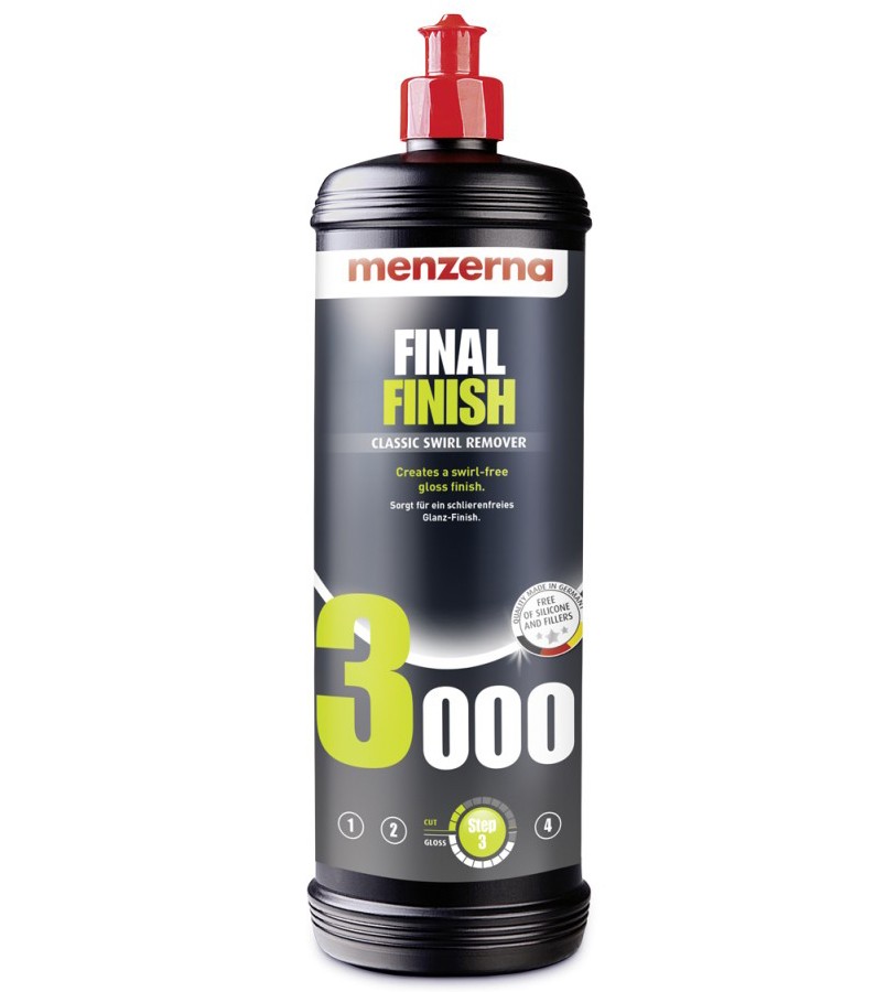 A Menzerna Final Finish egy könnyű, befejező polírozó paszta, amely kiváló fényt ad a festékfelületnek. Hatékonyan távolítja el a kisebb festékhibákat, például a finom karcolásokat, hologramokat. Eltávolítja a 3000 szemcsét. Nem tartalmaz szilikont. Minimalizálja a porosodást a gépi polírozás során.Fő tulajdonságok
