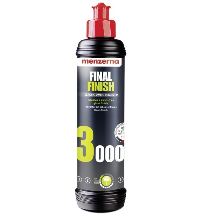 A Menzerna Final Finish egy könnyű, befejező polírozó paszta, amely kiváló fényt ad a festékfelületnek. Hatékonyan távolítja el a kisebb festékhibákat, például a finom karcolásokat, hologramokat. Eltávolítja a 3000 szemcsét. Nem tartalmaz szilikont. Minimalizálja a porosodást a gépi polírozás során.Fő tulajdonságok