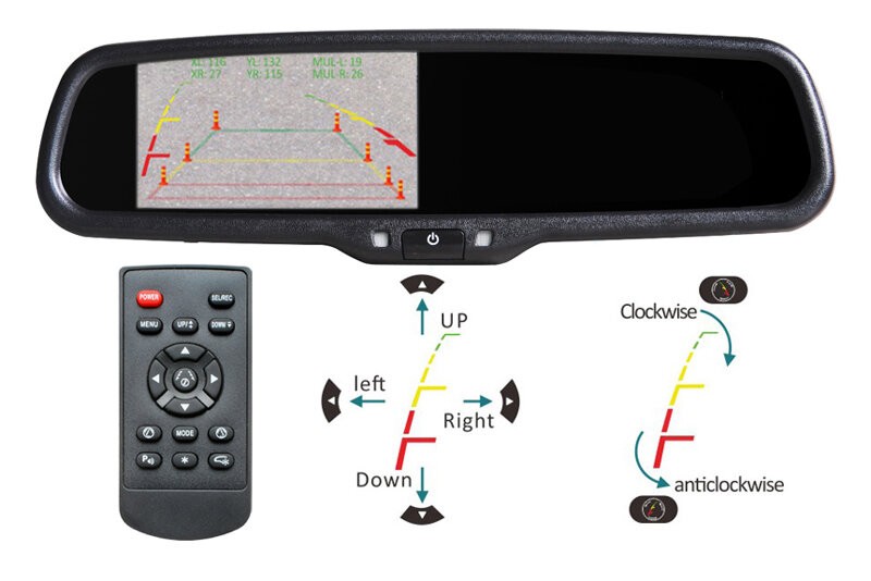 A visszapillantó tükörben lévő monitor a parkolókamera képének megjelenítésére vagy a DVD-lejátszó képének megjelenítésére szolgál. A tükör a szélvédőn található az eredeti tükör helyén. Könnyen felszerelhető az autó belsejének zavarása nélkül. A parkolókamera képe automatikusan aktiválódik, ha a hátrameneti fokozatot bekapcsolják vagy videojelet csatlakoztatnak.A parkolókamera irányvonalak beállítása: