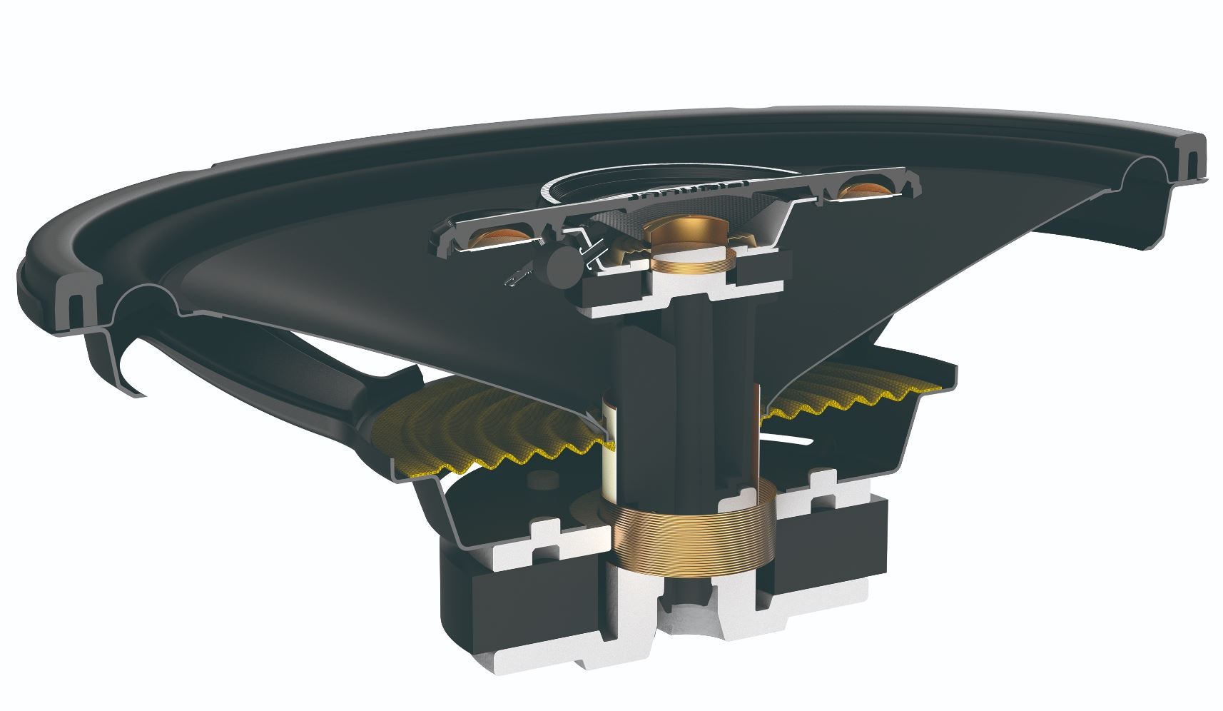 | Hangszórók típusaKoaxiális hangszórók: A koaxiális hangszórókra jellemző az all-in-one kialakítás. A magas- és középsugárzó egy kosárban van. Előnye az egyszerűbb szerelés, de a szalagok egy hangszóróban való összekapcsolása vagy egymáshoz való közelsége miatt a hangminőség általában romlik. Általában a mélyközépsugárzó közepén található egy magassugárzó, amelynek hangtekercse a közös mágneskör második légrésében működik. A háromutas koaxiális hangszóró egy középső mélysugárzóból, egy középső hangszóróból és egy külön sugárban elöl elhelyezett, különálló magassugárzóból áll. Komponens hangszórók: A komponens hangszórókat az egyes frekvenciasávokra való felosztás jellemzi, adott esetben magas- + közép- és mélyhangszóró + basszus. Az egyes hangszórók teljesen különállóan helyezhetők el, ami jobb hangzást és akusztikai teljesítményt eredményez. A komponens hangszórók túlnyomó többségéhez egy külső kapcsolót is mellékelnek, amely szétválasztja a magassugárzót, a közép/középsugárzót és háromsávos hangszóró esetén a basszust, vagy lehetővé teszi a magassugárzó decibelszintjének (pl. +2 dB, 0 dB, -2 dB), meredekségének (pl. 6dB/okt. 12dB/okt.) vagy aktív vagy bi-amp kapcsolásának beállítását. | Koaxiális 4 utas |