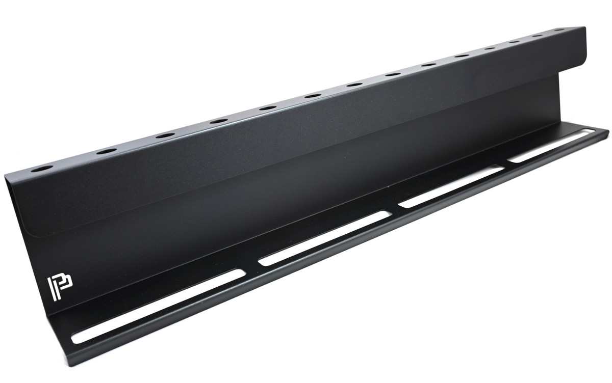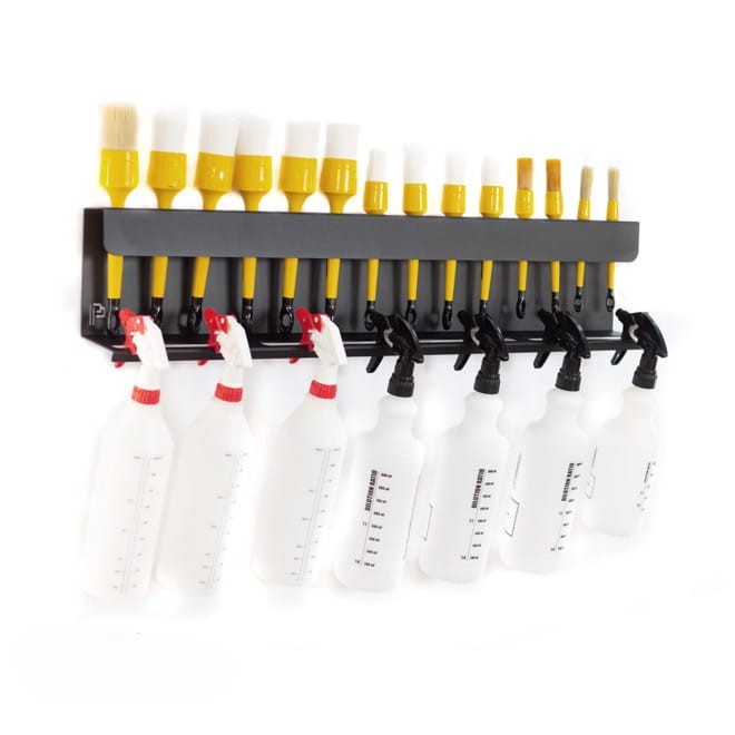 A Poka Premium Holder for Brush and Bottles egy 80 cm széles, falra szerelhető tartó keverőflakonokhoz és részletező ecsetekhez. Funkcionális és kényelmes tartó ecsetek és keverőflakonok számára. A felső lyukak (14) a legtöbb kapható ecsethez, az alsó lyukak (4) pedig a legtöbb típusú szórófejes keverőpalackhoz alkalmasak. A masszív szerkezet több mint 20 kg-os terhelést is kibír. A falra csavarozáshoz szükséges rögzítőfuratok a polc tetején találhatók, így garantálva a teljes stabilitást. A tartó kiváló minőségű fémből készült, amely az oxidáció elleni védelem érdekében porszórt bevonatot kapott. A tartó testét a látványos Poka Premium logó díszíti.