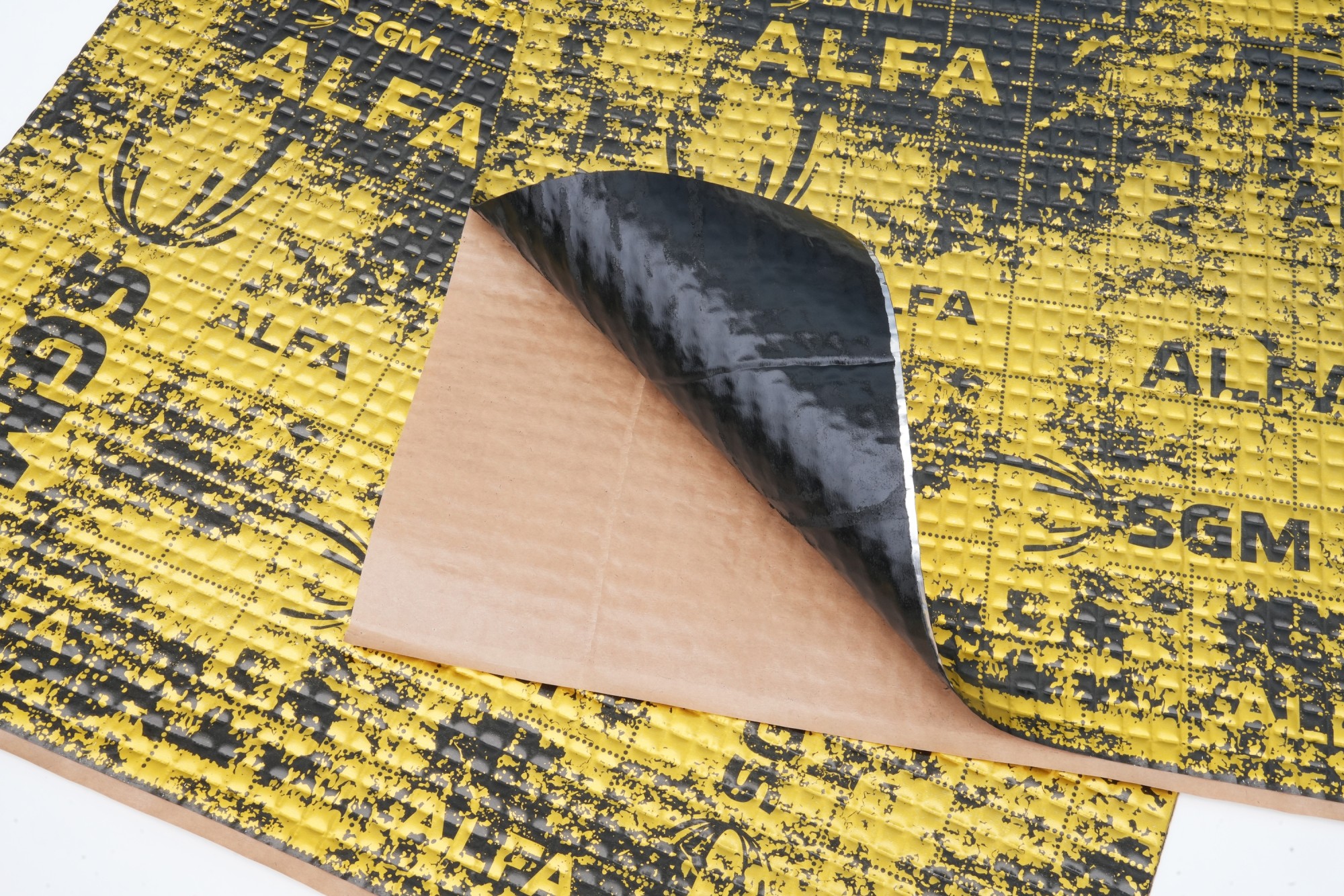 Az SGM második legmagasabb modellcsaládjának rezgéscsillapító anyaga, amely egy új generációs öntapadó polimer butilgumiból és egy 100 mikron vastagságú alumíniumfóliából áll. A fekete lakkozott négyzet alakú dombornyomott fólia modern nyomtatással rendelkezik, az anyagot a rögzítési oldalon szilikonozott fólia védi. Az Alpha sorozat rezgéscsillapító anyaga különösen kiemelkedő tulajdonságaival, nagyon magas akusztikai veszteségtényezőjével (MLF), a fémfelületekhez való nagyfokú tapadásával és stabilitásával tűnik ki. A 0,45 egységnyi akusztikai veszteségtényező a 4 mm-es vastagsággal együtt kiváló rezgéscsillapítási képességet biztosít. A legnagyobb különbség a Beta sorozathoz képest a speciális anyagösszetételnek köszönhető jelentősen magasabb hatásfok, valamint a jobb tapadás a fémhez és a vastagabb alumíniumfólia. Mint minden SGM rezgéscsillapító anyag, az Alpha sorozat anyagai is víz-, nedvesség-, olaj- és korrózióállóak..jpg)