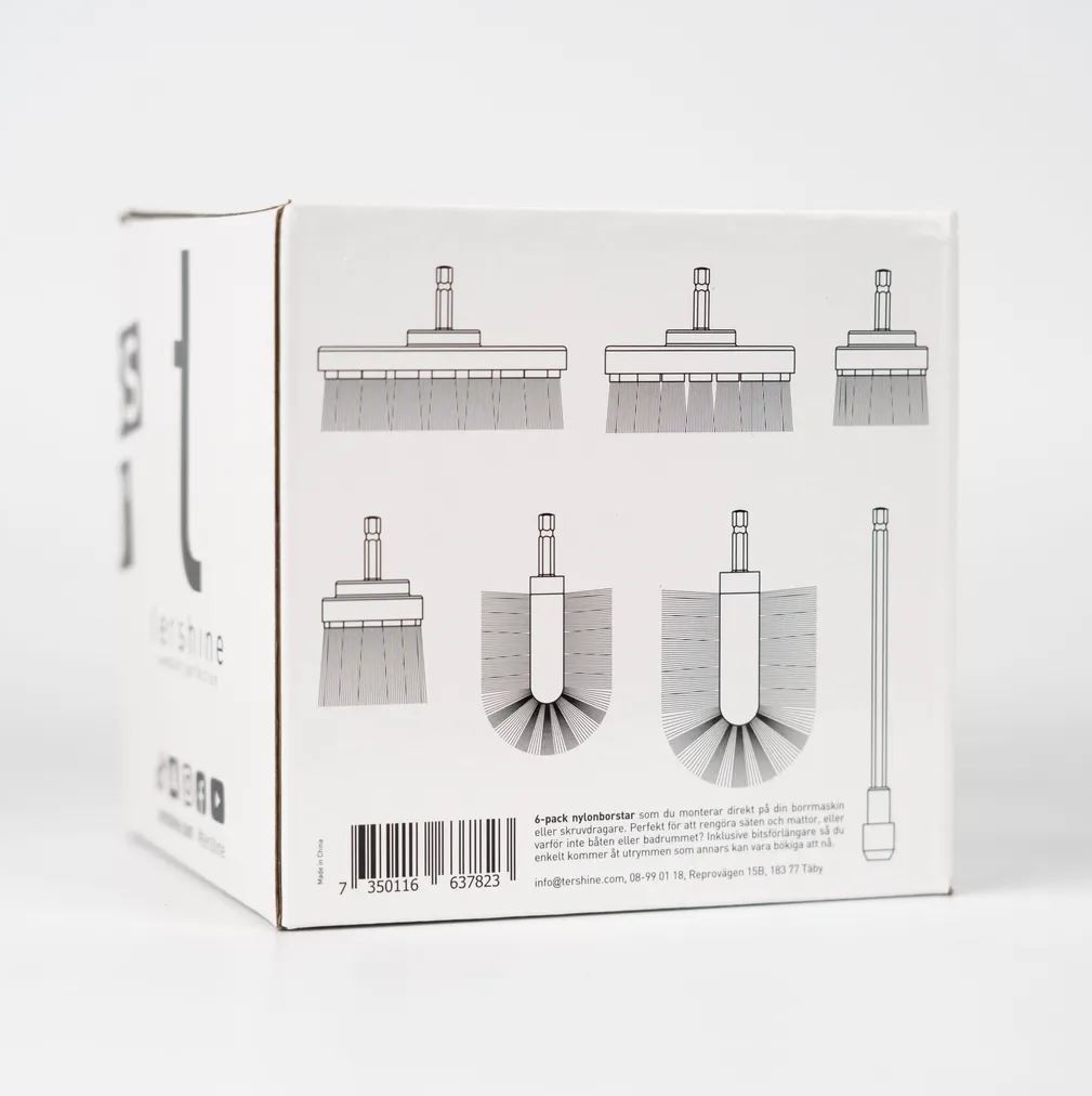 6 db nejlonkeféből álló csomag, amely közvetlenül a fúrógépre vagy akkumulátoros csavarhúzóra szerelhető. Tökéletes eszköz ülések vagy szőnyegek tisztításához. A készlet tartalmaz egy 15 cm-es kiegészítőt (bitet), amely lehetővé teszi, hogy olyan területeket is elérjen, amelyeket egyébként nehezen tudna elérni. Nagyszerű kombináció a Tershine APC-vel együtt az autók belteréhez, de a lakásban is, vagy a Tershine Extract-tel együtt a "beevődött" és makacs szennyeződésekhez, pl. erkélyen/erkélyen/hajón stb. történő tisztításhoz.