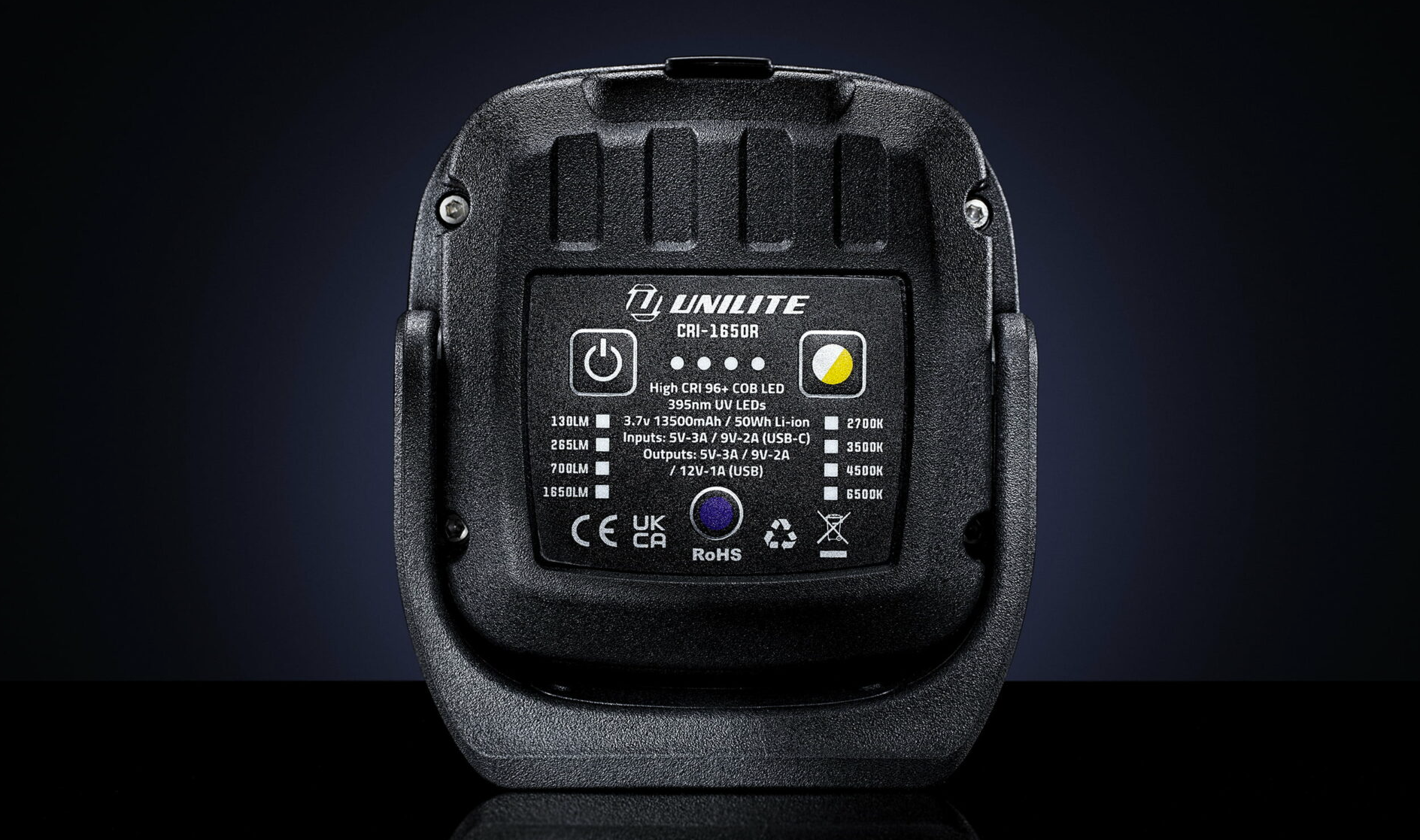 A teljesítményt és a kompakt kialakítást egyaránt ötvöző CRI-1650R egy megfizethető árú munkalámpa. Az 1650 lumenes COB LED 96+ CRI-vel rendelkező, nagy teljesítményű, 1650 lumenes COB LED kiváló fényerősséget biztosít. A 2700K / 3500K / 4500K / 6500K színhőmérséklet-tartomány kiválasztható a színhibák és a hologramok kiemelésére. Használható továbbá a munkához szükséges tökéletes fényárnyalat megtalálásához. A rendkívül tartós nejlon és alumínium szerkezet biztonságban tartja. A hátsó mágnesek és a talapzaton lévő menetes furat praktikus használatot biztosít tartás nélkül. Az 13500mAh-s USB Type-C lítium-ion akkumulátor akár 149 órán át is bírja.Az Unilite CRI-1650R fő tulajdonságai