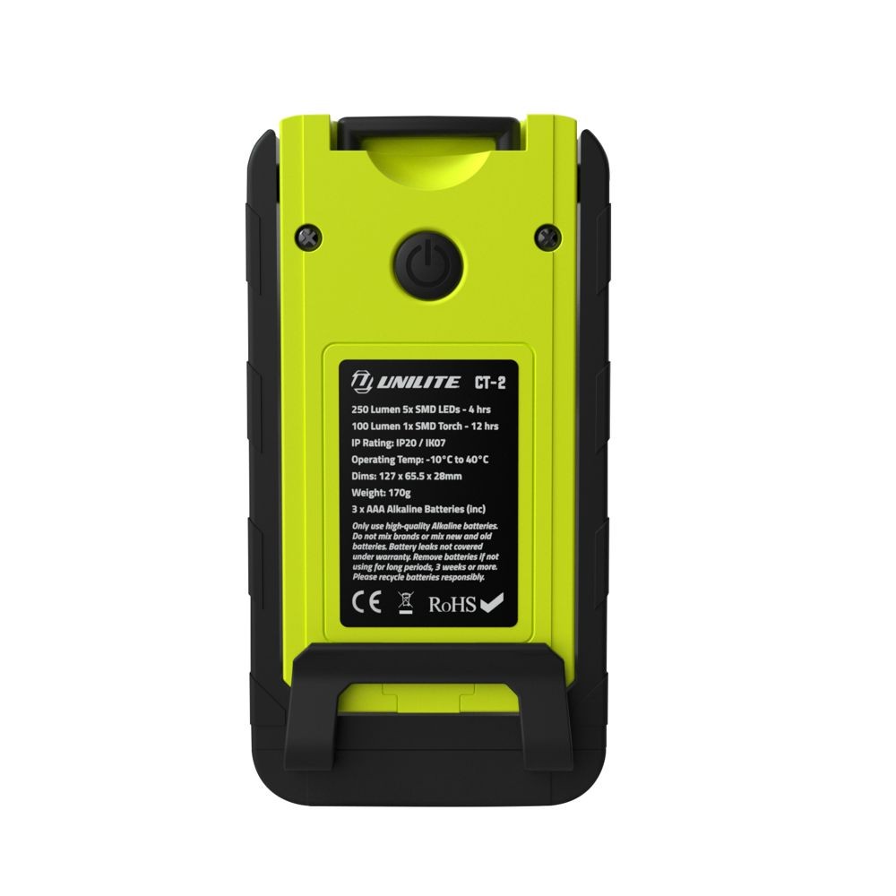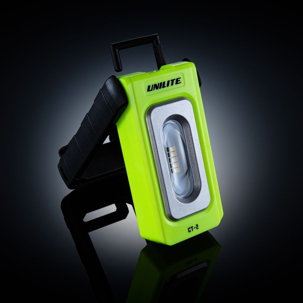 Az Unilite CT-2 LED-es vizsgálati munkalámpa egy kompakt lámpa 250 lumen kimeneti fényerővel. Az erős ABS műanyag szerkezet és az IK07 ütésállóság tökéletes védelmet biztosít a lámpa számára. A munkakörnyezetben való elhelyezéshez 360°-ban elforgatható mágneses állvánnyal és behúzható akasztóval rendelkezik. A zseblámpa egy hasznos 100 lumenes felső lámpával is rendelkezik, amely szűk helyeken is elfér.