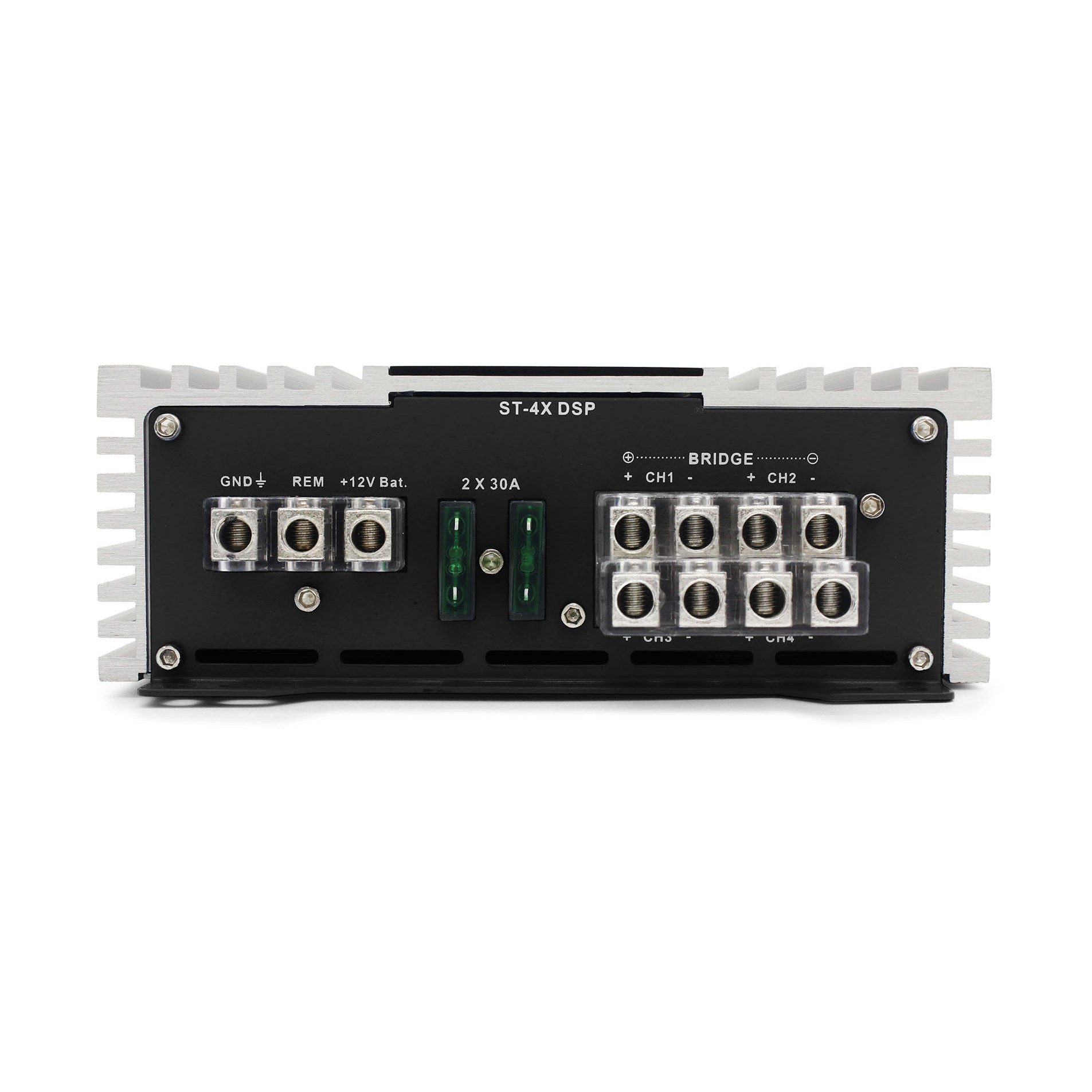 4 csatornás erősítő DSP processzorral, 4 x 65 / 2 x 180 W RMS (4 Ω), AB osztályú